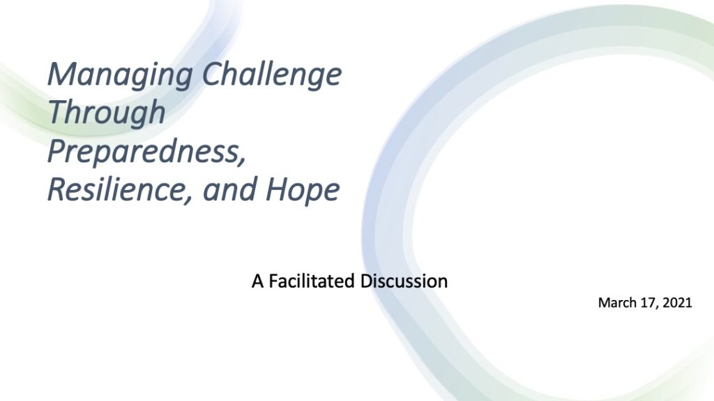 Initially this was an illness from a country on the other side of the globe – until it wasn’t. And then it became an experience like no other in recent memory, affecting us within our families, at work, in every aspect of our lives. Jill Dorsi facilitated a discussion with attendees who were able to share stories about the current pandemic as well as other emergent, unexpected events.
