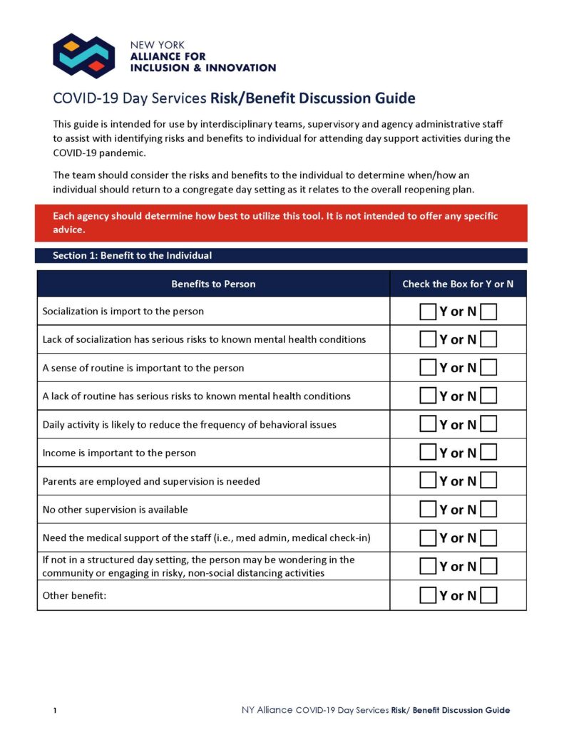 This guide is intended for use by interdisciplinary teams, supervisory and agency administrative staff to assist with identifying risks and benefits to individual for attending day support activities during the COVID-19 pandemic.
